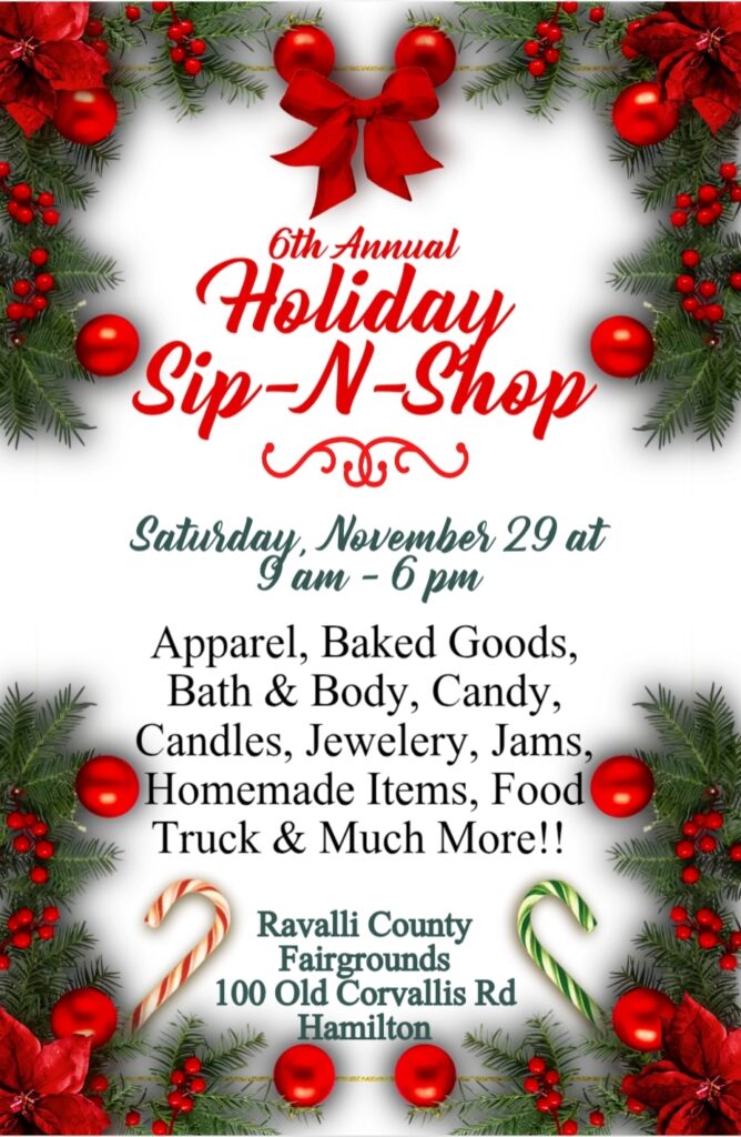 Come join us in the Event Center at Ravalli County Fairgrounds in Hamilton, Mt for the return of our 6th Annual Holiday Sip N Shop! This epic event has EXPANDED our hours, due to popular demand, Open from 9am-6pm. Come down and start your Christmas Shopping. So many amazing vendors from Rustic Signs, Handmade Jewelry, Holiday goodies, Honey, Candles, Bath & Body, and sooooo much more.